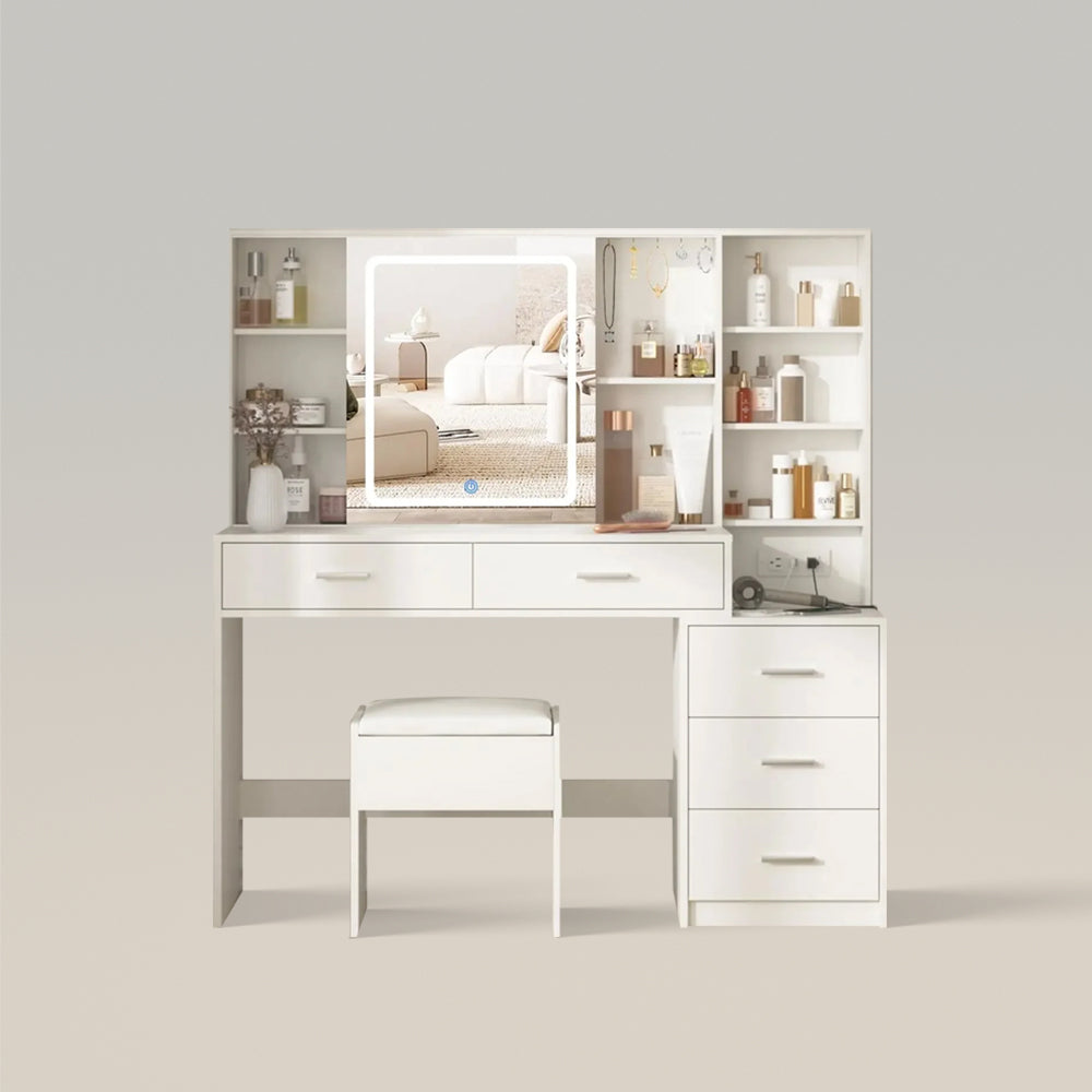 Amplio espacio de almacenamiento y escritorio grande : este tocador de maquillaje con luces viene con estantes de almacenamiento ocultos, estantes de almacenamiento abiertos, 5 cajones grandes y una mesa grande, que puede contener fácilmente todos sus cosméticos, joyas, secador de pelo, rizador y otros elementos esenciales de belleza. Además, el estante en la parte superior del tocador también puede colocar algunos libros o decoraciones livianas. Le permite tener un escritorio ordenado a partir de ahora.