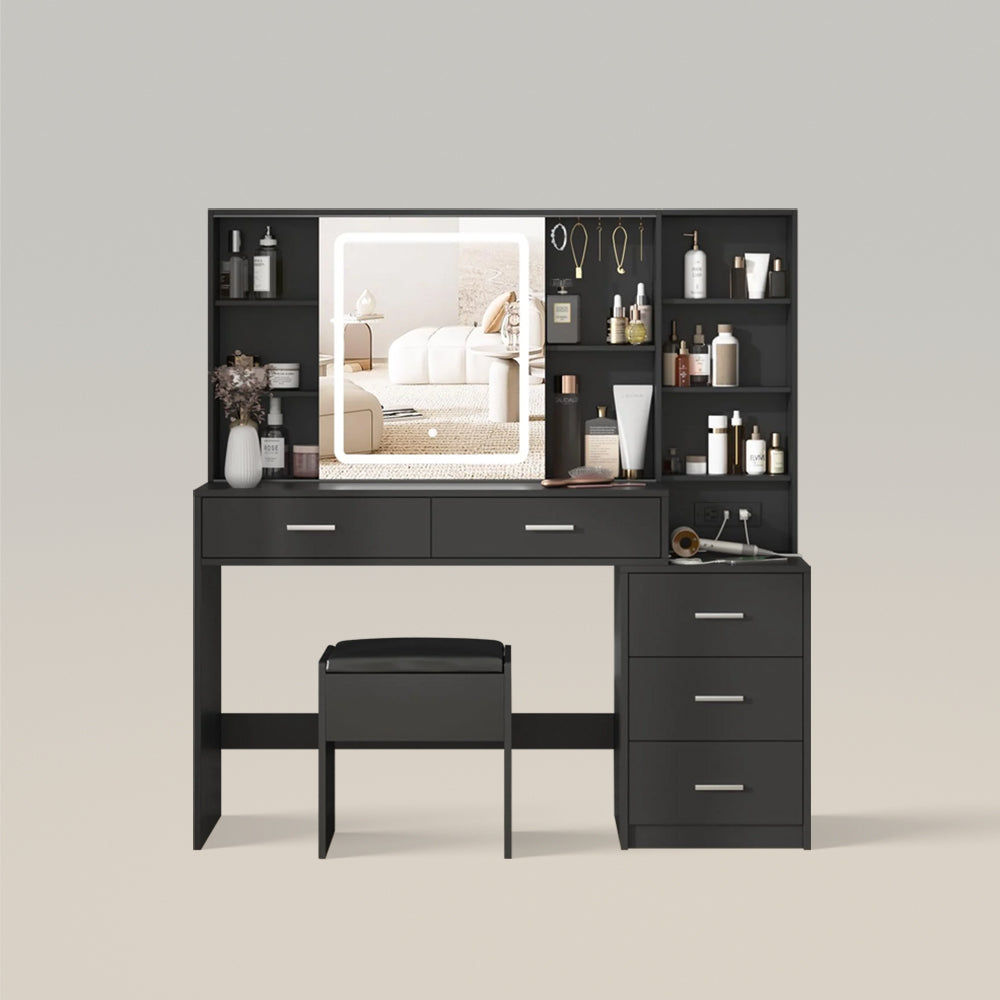 Diseño exclusivo de ganchos : diseñamos los ganchos en función de la investigación de mercado y las necesidades de los clientes. Los 5 ganchos de la mesa de maquillaje se pueden usar para colgar collares y aretes. ¡El diseño portátil hace la vida más cómoda! Tocador con espejo Tamaño: 51,18" (Ancho) x 15,74" (Profundidad) x 53,39" (Alto).
