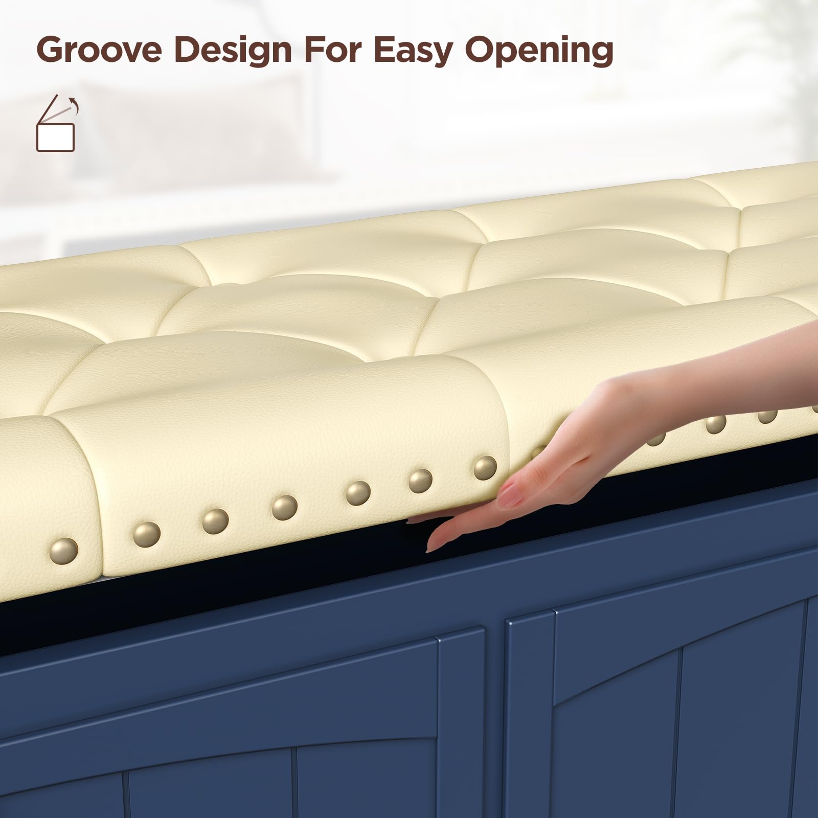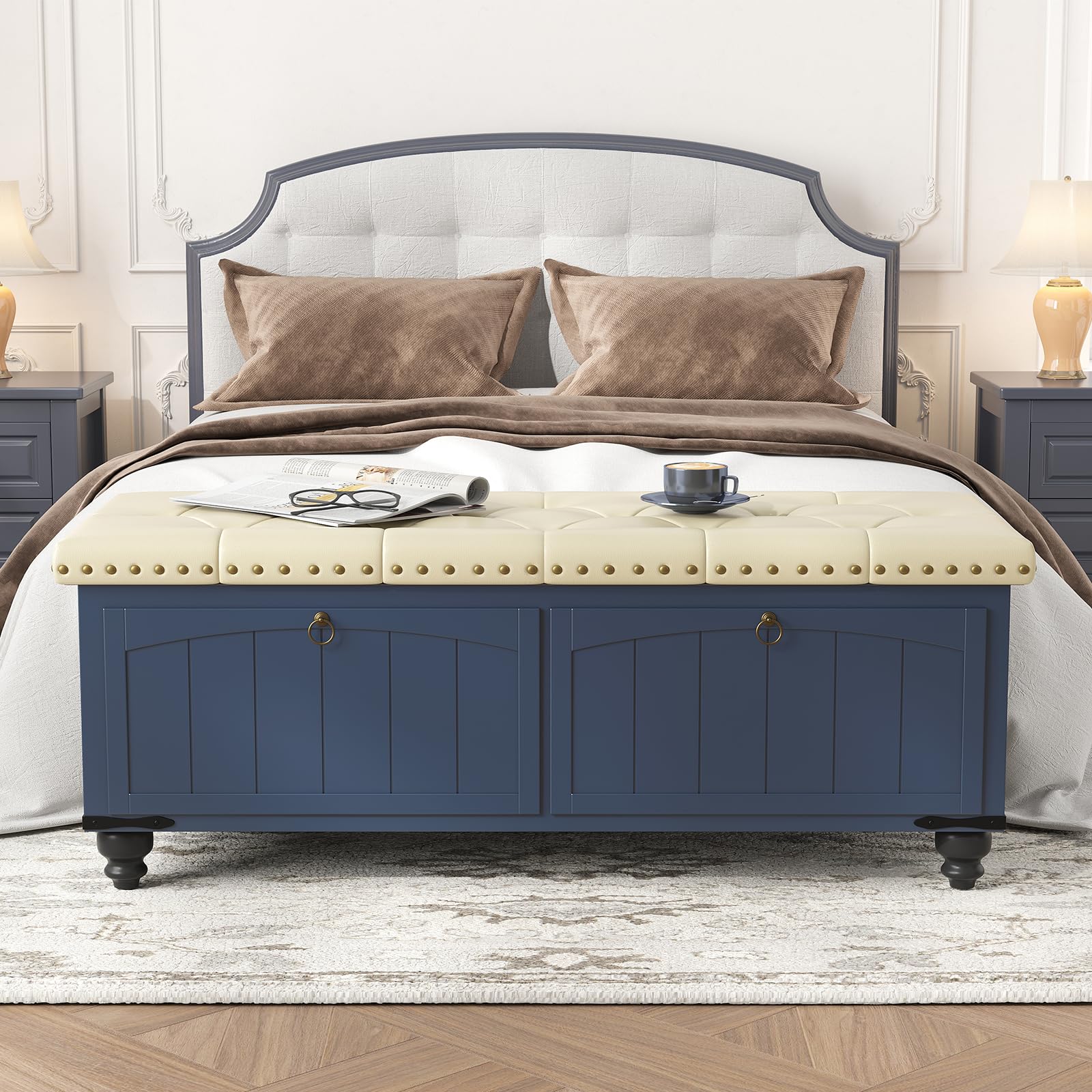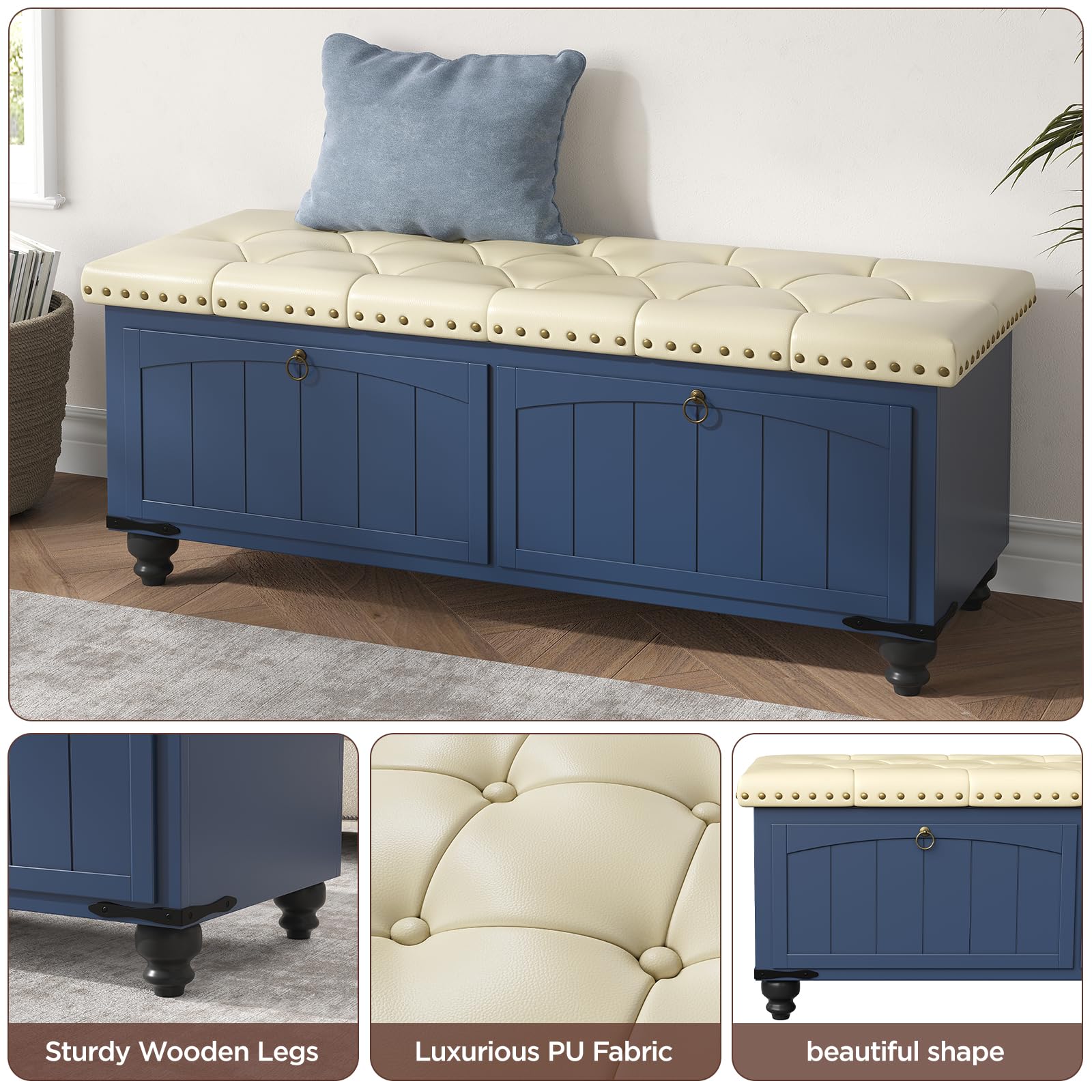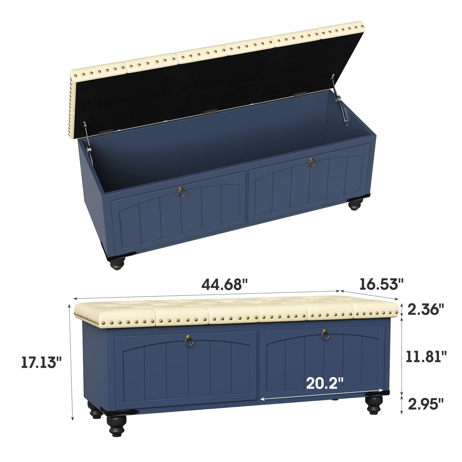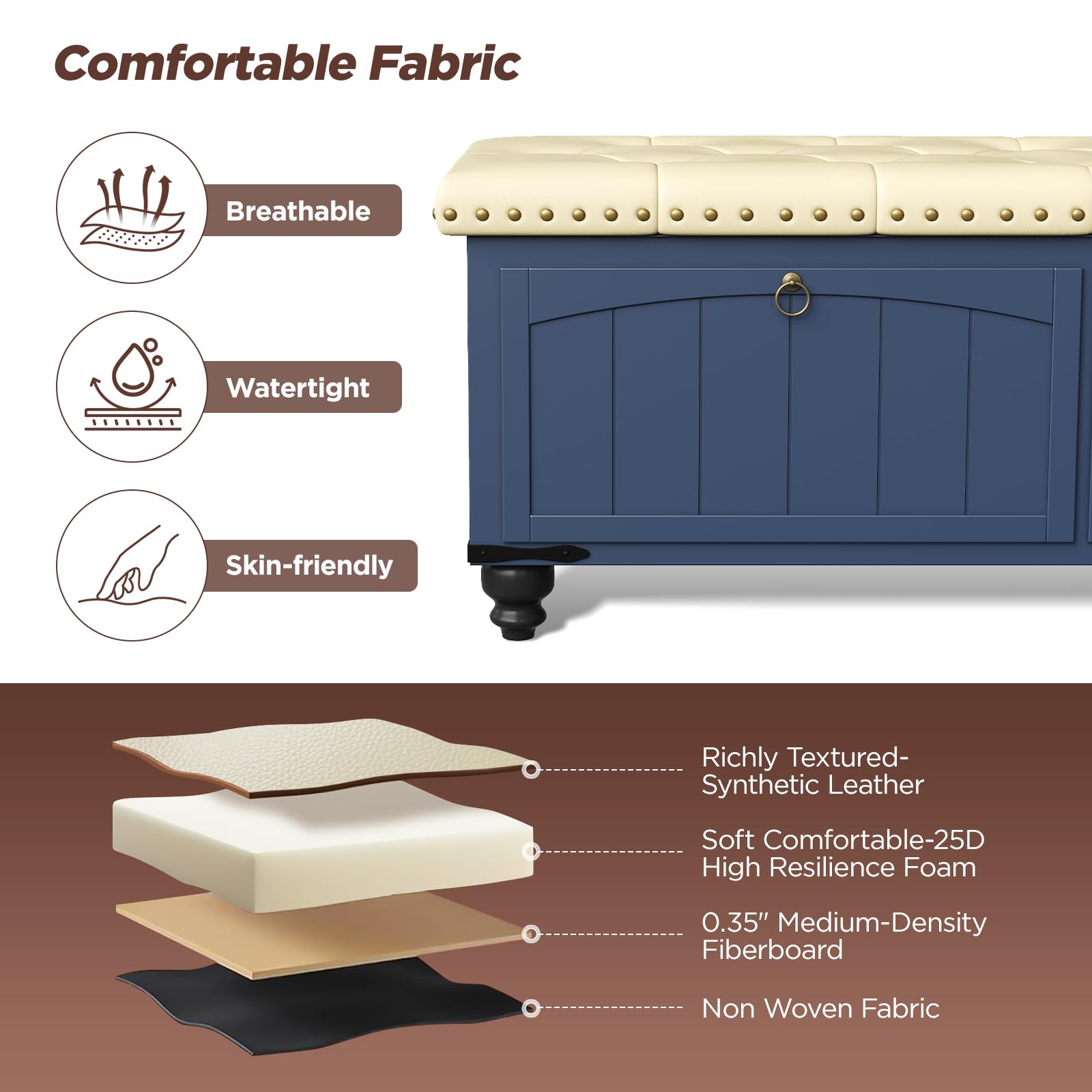 High-Quality Upholstered Storage Ottoman, Elegant Blue Bench with Wooden Frame & Safety Hinge