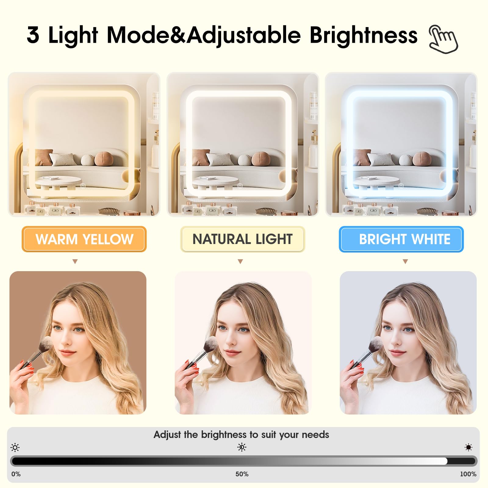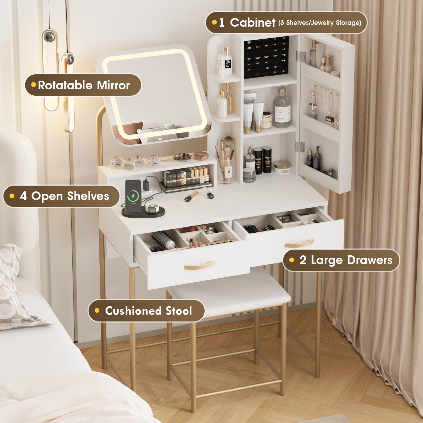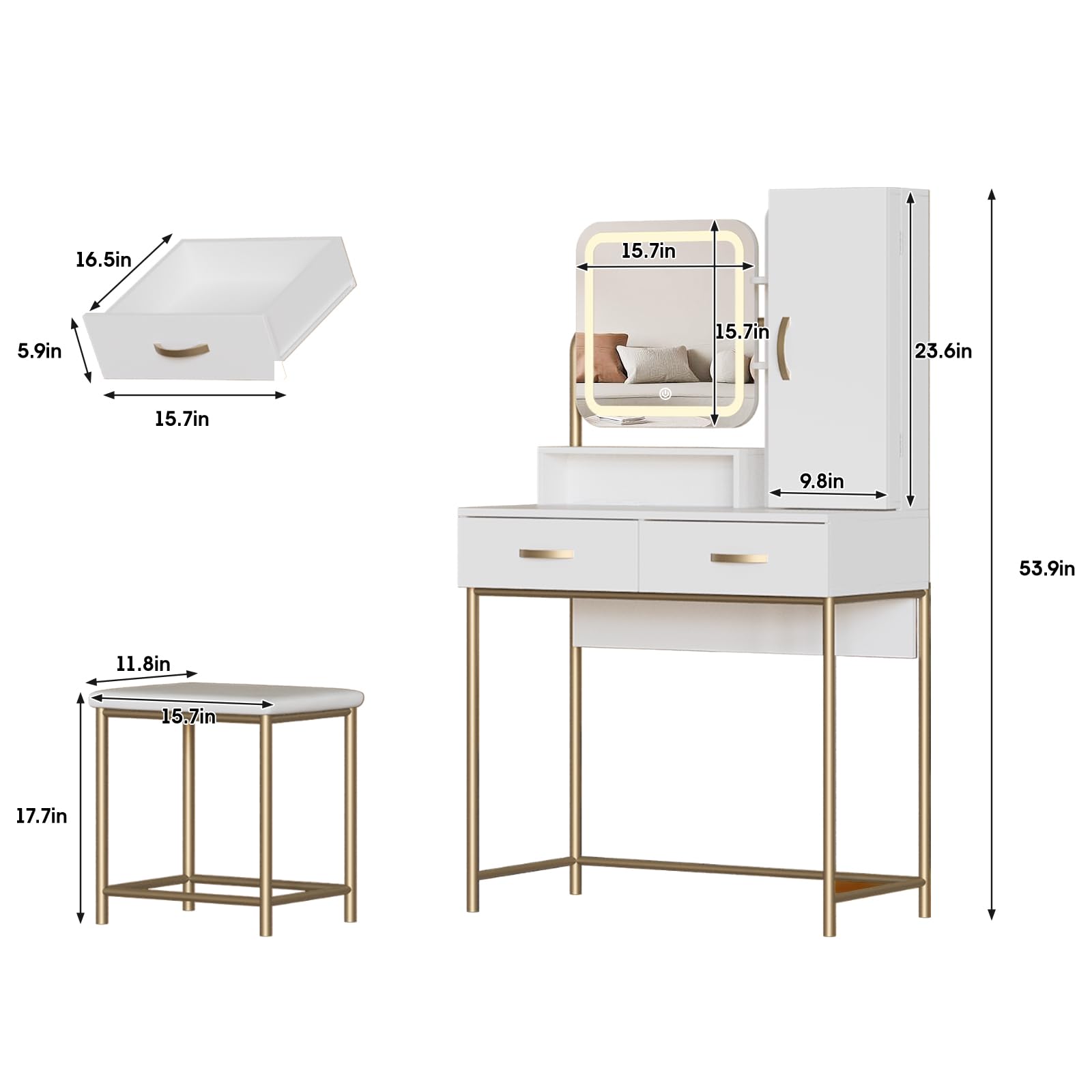 Diseño elegante y funcional --- Tocador blanco con espejo giratorio y luces LED regulables. Elija entre configuraciones de luz cálida, fría o natural para lograr el brillo perfecto para looks de día o de noche, asegurando una aplicación de maquillaje impecable en todo momento. El diseño elegante complementa cualquier decoración al tiempo que maximiza el espacio y la utilidad.