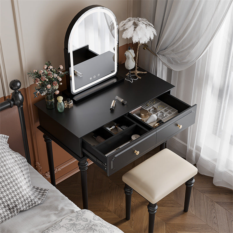 This elegant vanity table complete with a high-tech LED mirror and a comfortable cushioned stool. Designed with both style and functionality in mind, this vanity set is the perfect addition to any bedroom or dressing area.