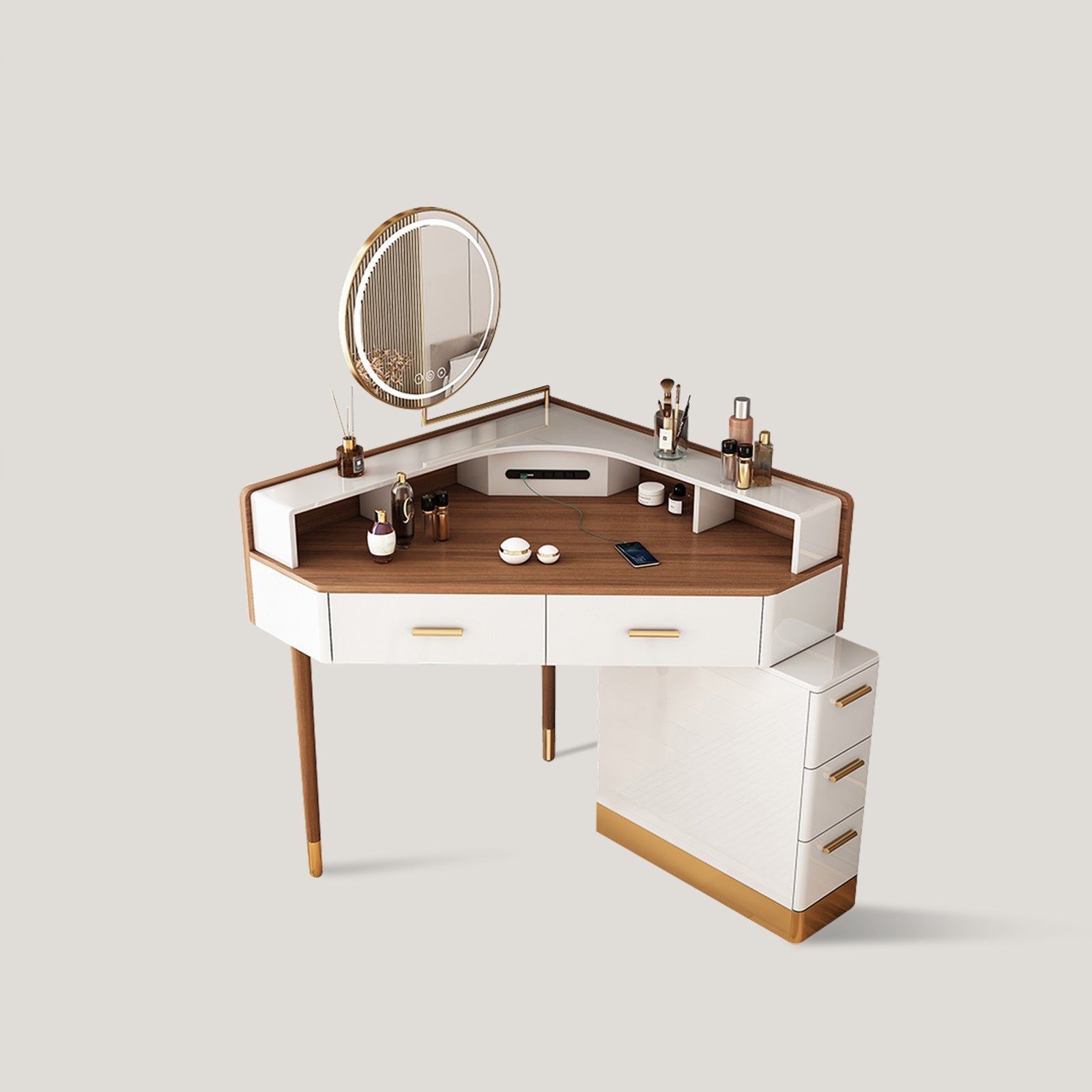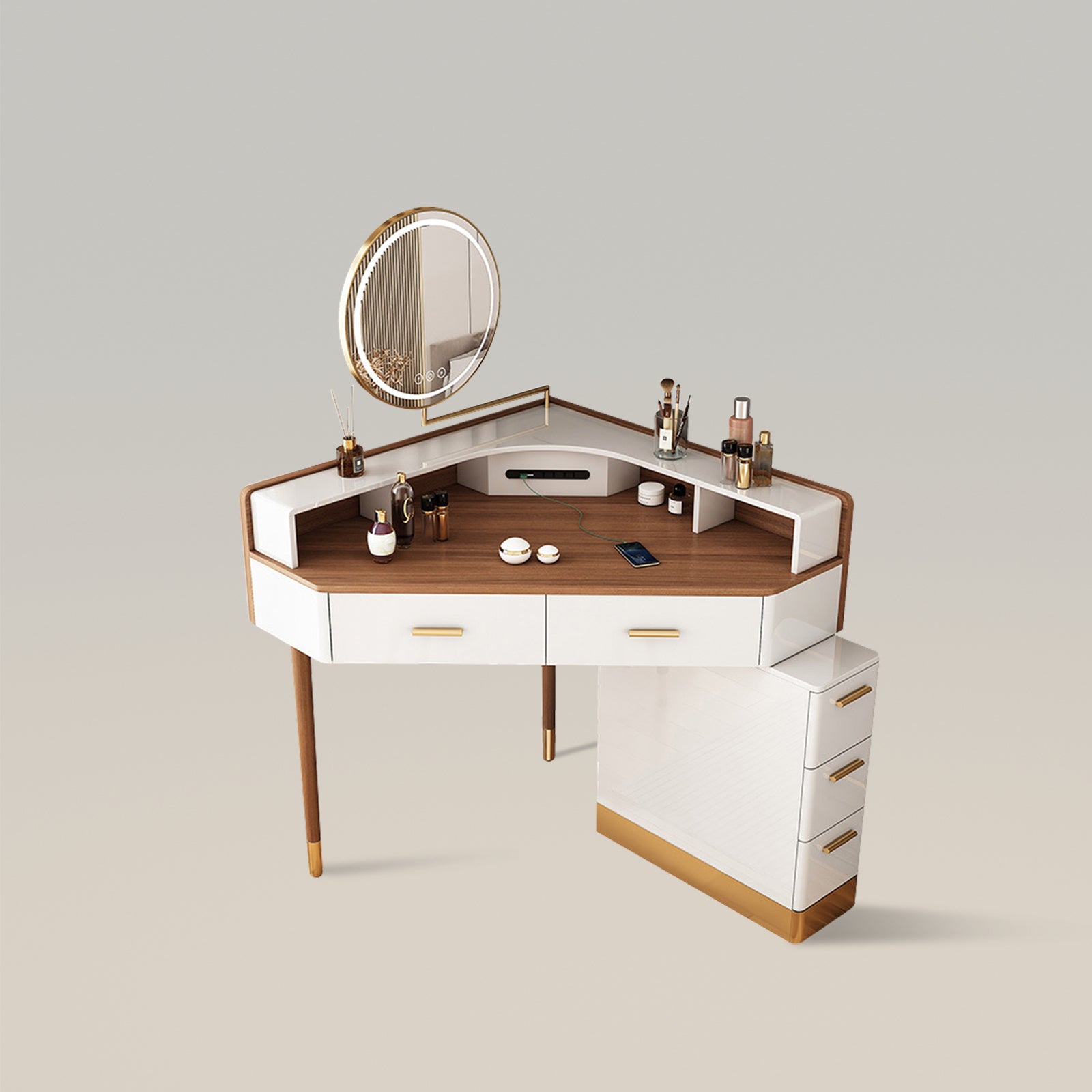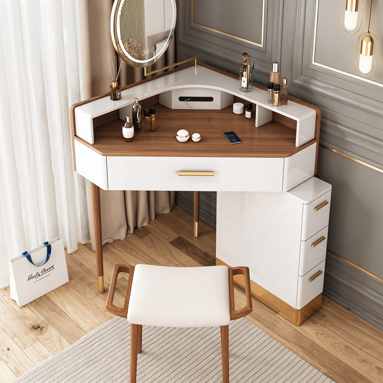 Space-Saving Corner Design: This triangular-shaped corner vanity is specially designed for small bedrooms, utilizing corner spaces effectively while maintaining a stylish and compact profile.