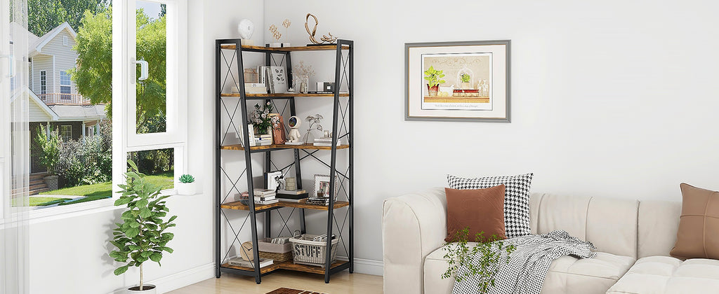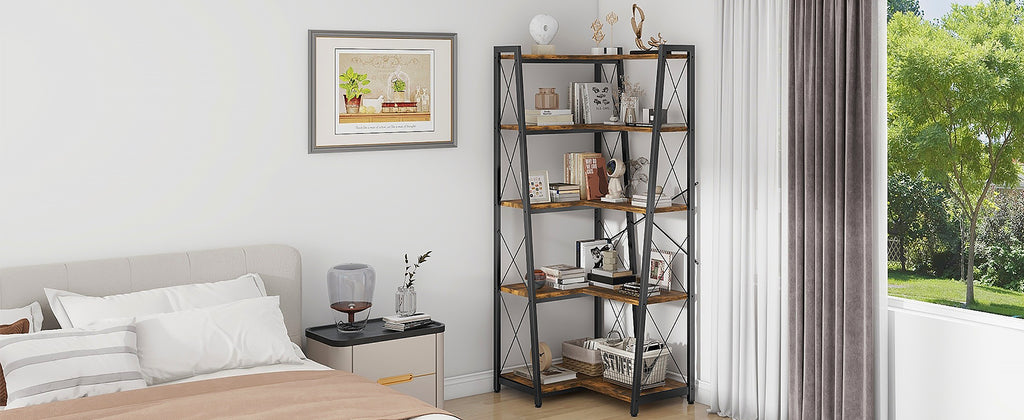 Streamlined and classic---Crafted with a sleek black metal frame complemented by wooden laminates, the bookshelf exudes a timeless industrial allure intertwined with vintage accents. Its minimalist L-shaped construction maximizes the utilization of compact corners, making it versatile for diverse settings while enhancing both functionality and visual charm in your living area.