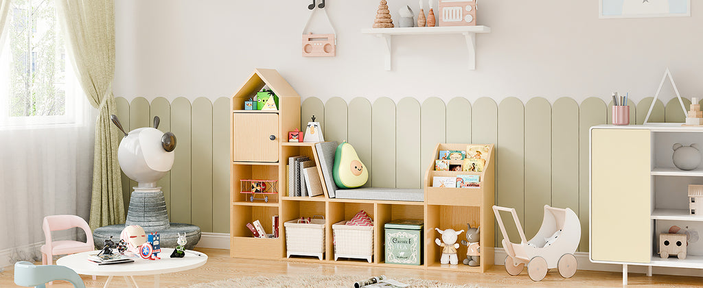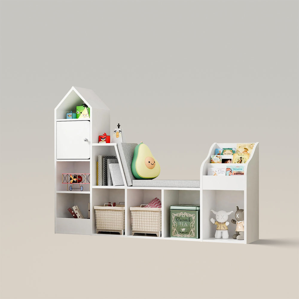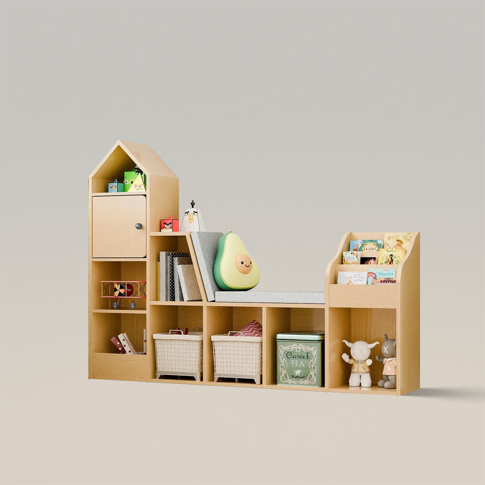 Multi-Functional Design---Discover the innovative features of this versatile masterpiece, seamlessly integrating storage cubbies, a book rack, a toy storage box, and a comfortable cushioned seat. It creates an organized and joyful play area for your child, offering convenient access to books and toys, keeping the space tidy and enjoyable.