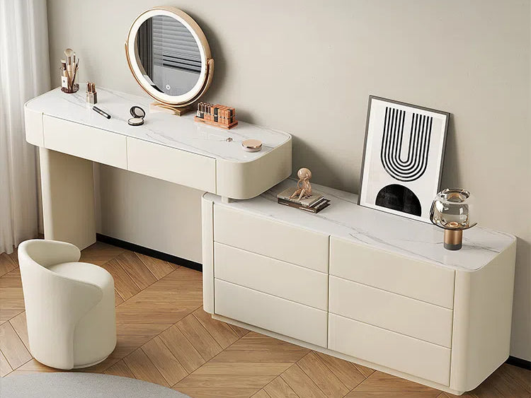 This all-in-one makeup vanity is perfect for compact bedrooms or small apartments. The integrated design combines a sleek vanity table with ample storage drawers, maximizing functionality without compromising on style.
