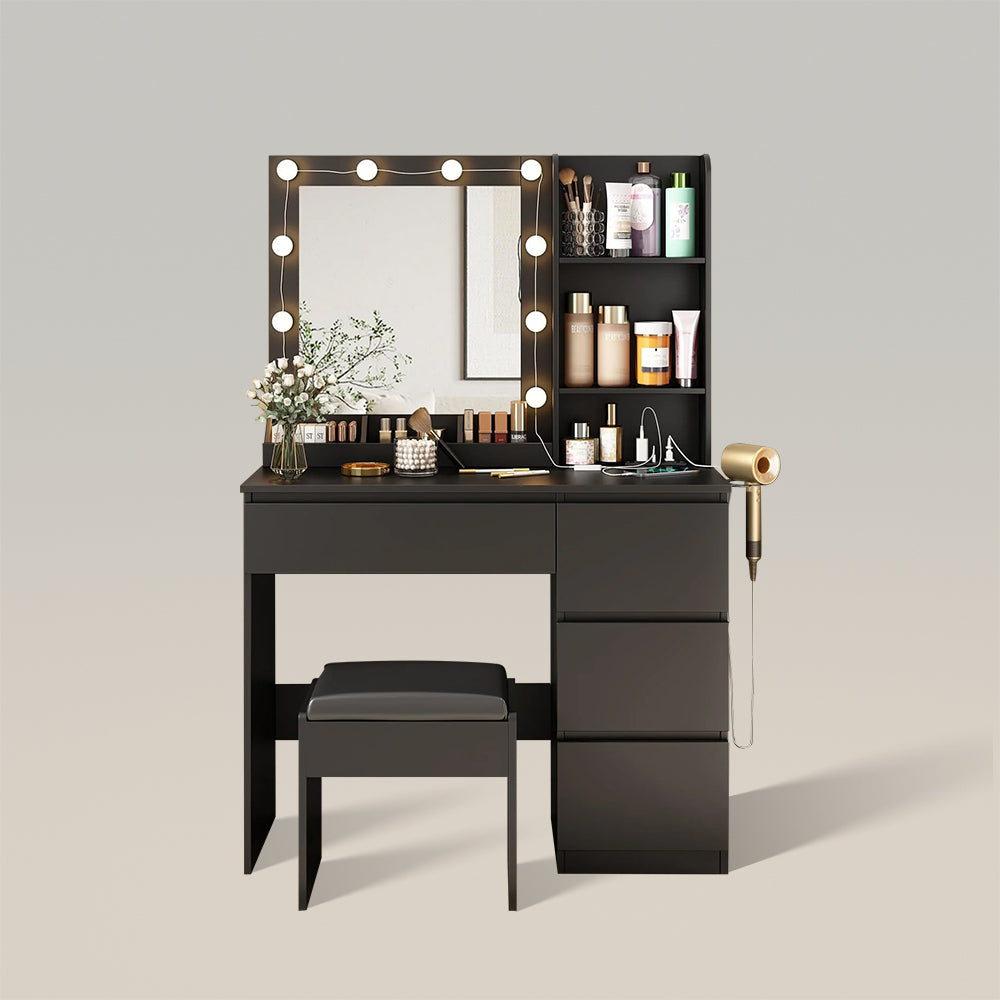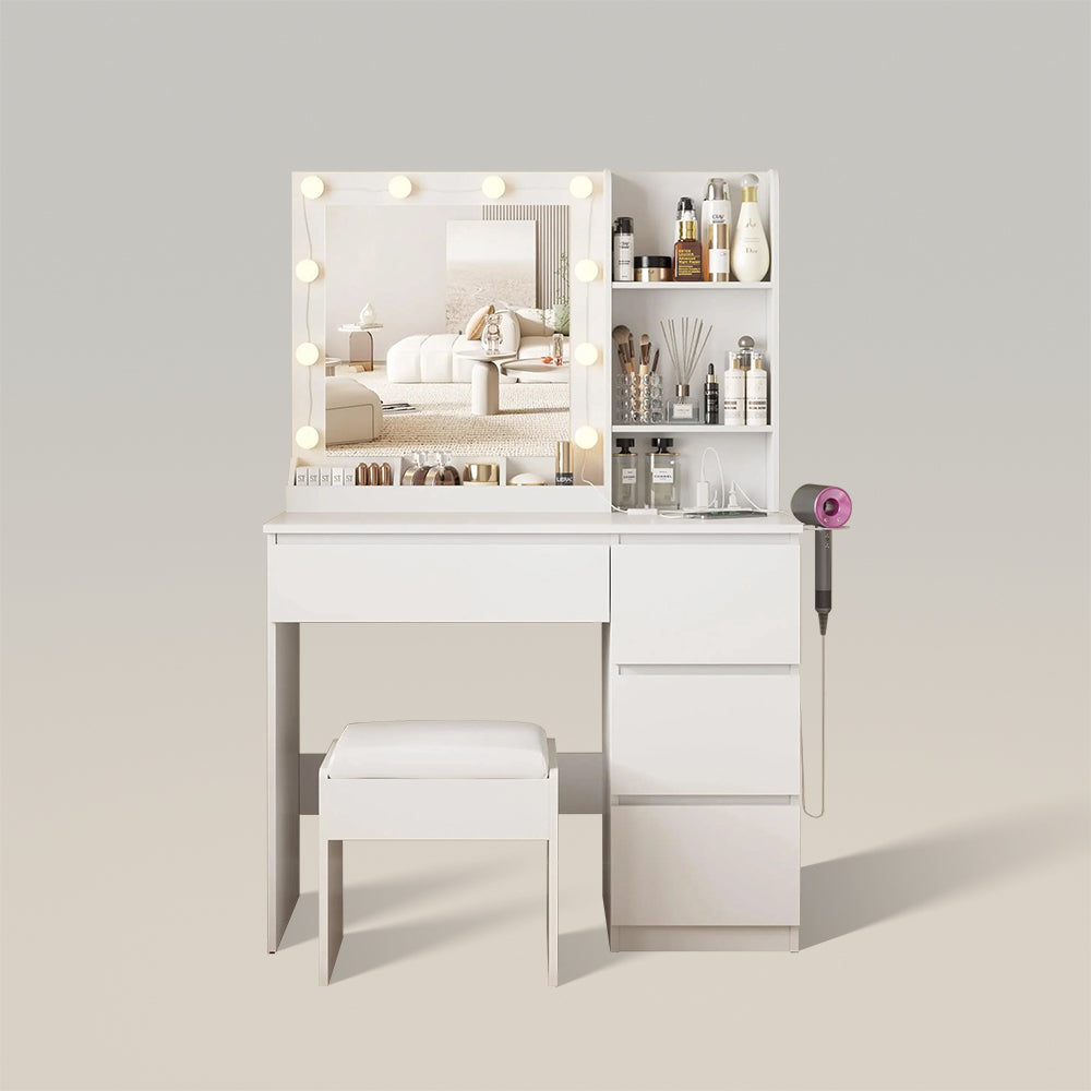 Ample Storage Space---This thoughtfully sized vanity mirror with lights and table set (31.5??¨¤(L)*15.8??¨¤(W)*57.7??¨¤(H)) offers ample storage. With spacious drawers, three shelves, and an extra cushioned stool, you'll have enough room for all your makeup essentials, hair tools, jewelry, and lotions. Keep your desktop organized and clutter-free.