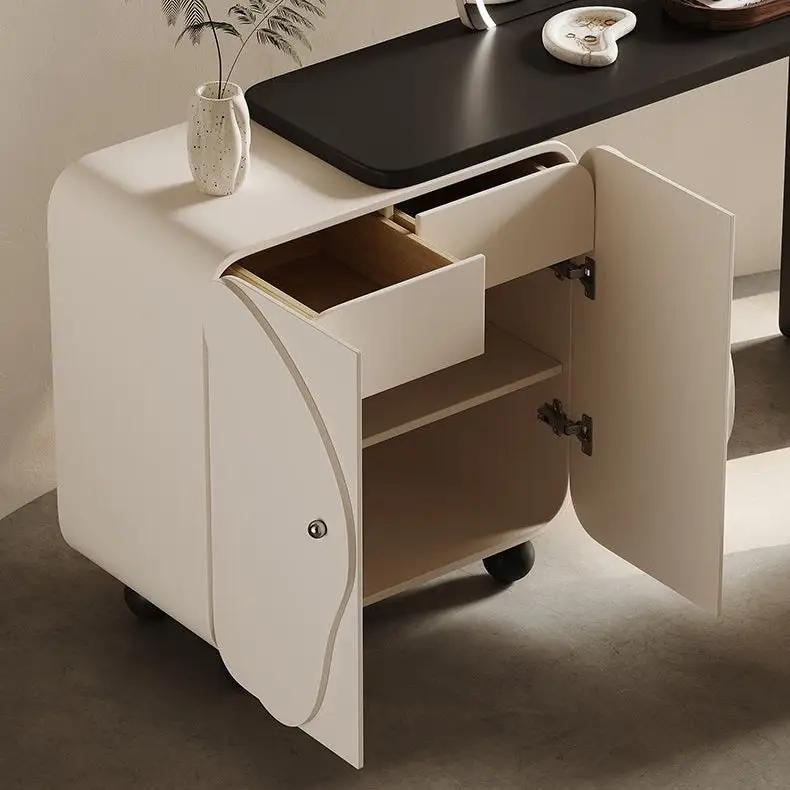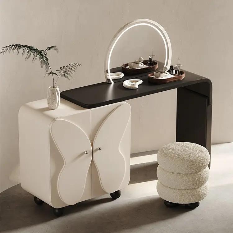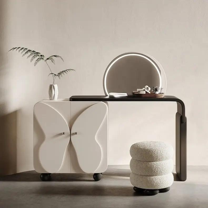 This elegant and multi functional piece combines a dressing table and storage cabinet, designed to add a touch of sophistication to your space. The extendable tabletop reaches up to 61.02", providing ample space for all your beauty essentials. The cabinet, in a creamy white finish, features charming butterfly-shaped doors, opening to reveal versatile storage solutions including two drawers and two open shelves, perfect for organizing various items.