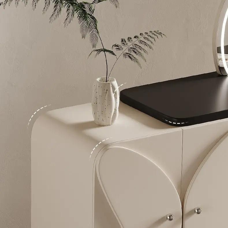 The dressing table is complemented by a round LED makeup mirror, ensuring flawless lighting whether it's day or night. The set includes a matching stool that offers excellent support and comfort, completing the luxurious and stylish look.