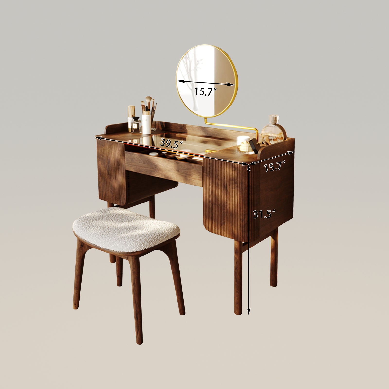 This makeup vanity combines elegance and functionality, featuring a sophisticated walnut finish that seamlessly fits into various home decor styles. It comes with a rotating mirror. The vanity offers multiple storage and display spaces, including shelves, drawers, and storage compartments inside the cabinet doors, making it easy to organize makeup, skincare products, and other small items. The included comfortable stool ensures an optimal seating experience during makeup sessions.