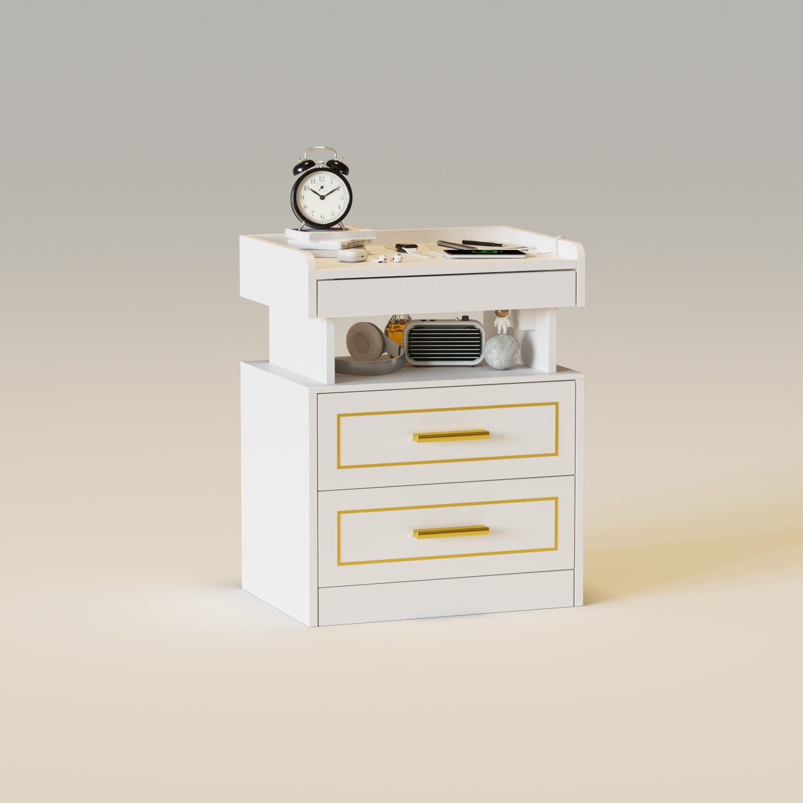 LED Nightstand with Charging Station--This led nightstand comes with a handy built-in charging station, making your life easier than ever. With two AC power outlets and two USB ports, your devices stay powered up and ready for action at all times. But what makes it truly unique is the freedom to choose which side to install the charging station, giving you the flexibility to place it just the way you like.