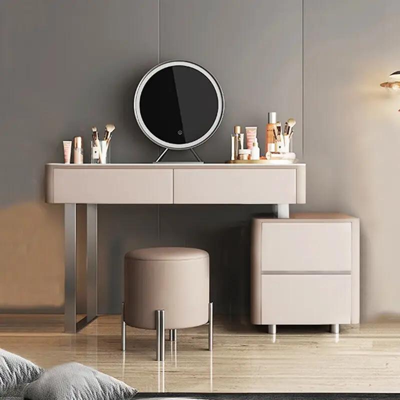 The surface of the vanity is wrapped in durable, eco-friendly microfiber leather, known for its strong breathability, comfortable touch, and easy maintenance.?