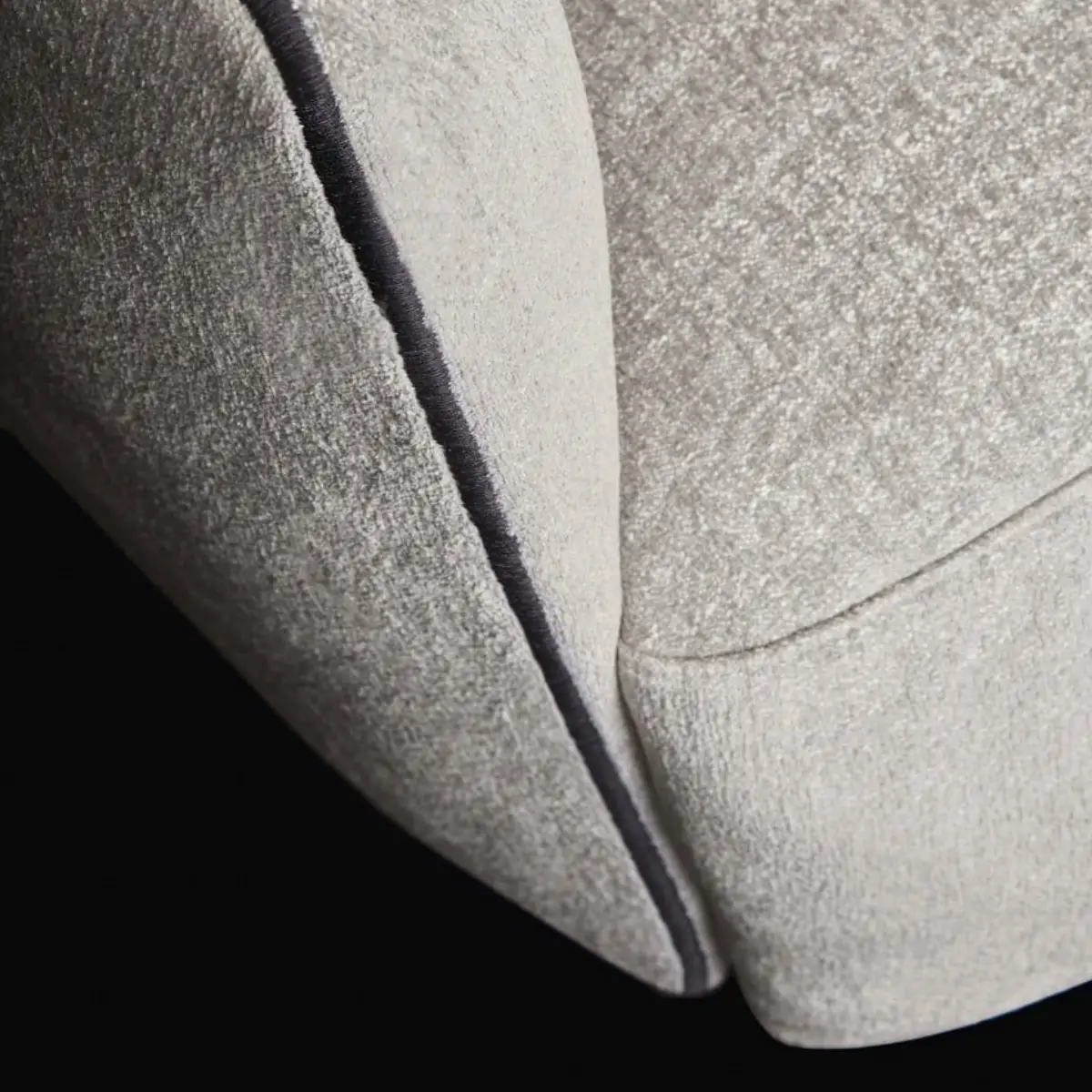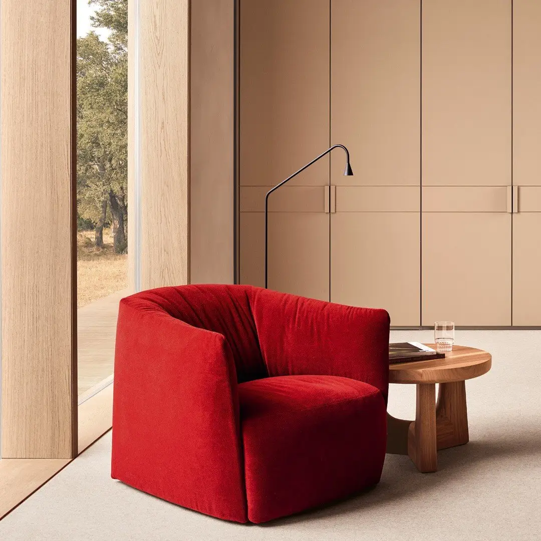 The armchair features enveloping, comfortable forms and sartorial details. The round padding gives it a pleasantly casual look.