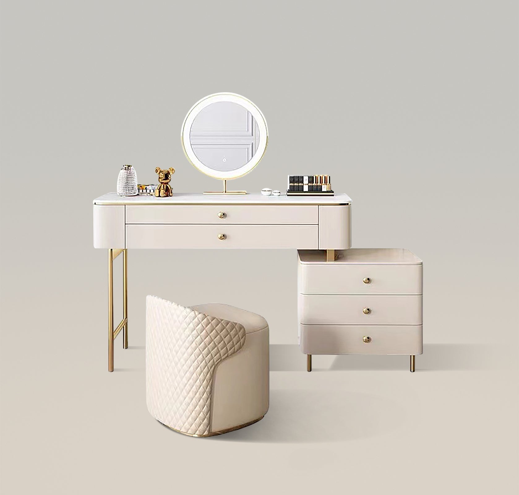 This vanity table showcases a contemporary minimalist aesthetic with clean lines and a refined silhouette, adding a touch of elegance to any bedroom or dressing area.