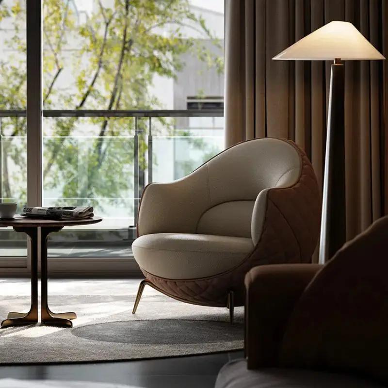 The leather sofa chair features a thick cushion and a medium-sized solid back, providing relief from back and waist pressure for a comfortable seat experience. The gold feet exude a retro atmosphere, enhancing the armchair firmness and stability.?