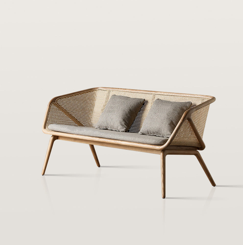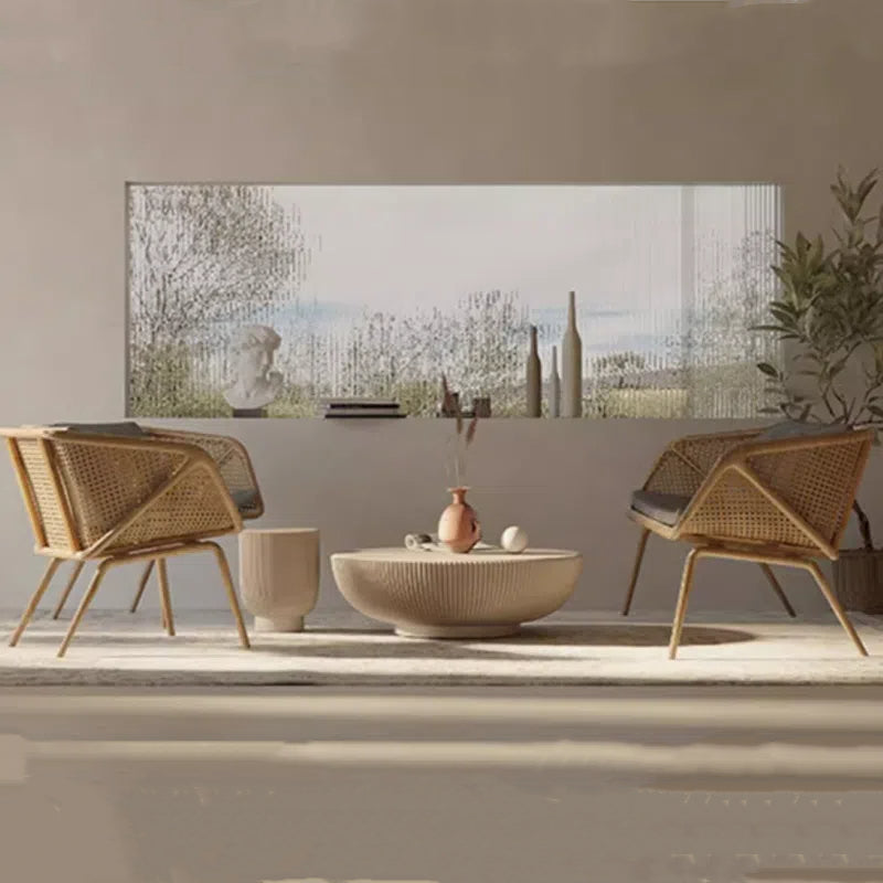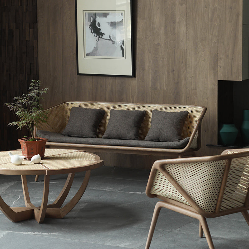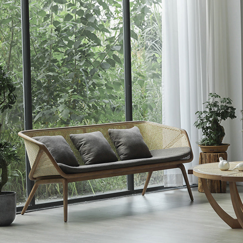 The dining room chairs are defined by a square back with a cane inset for farmhouse appeal. Its solid wood frame is a finished hue with some visible distressing for an antiqued touch. The breathable mesh rattan backrest helps to ventilate rooms and dissipate heat, maintaining a cool and dry sitting feeling.