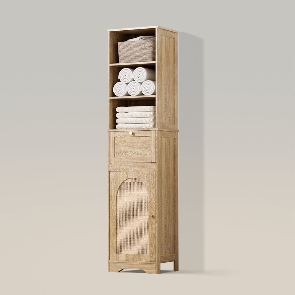 Ergonomically designed bathroom cabinets- The freestanding narrow cabinet make full use of the space of the room. The rattan cabinet with drawers make the kitchen countertop spacious and tidy, bringing you a comfortable and elegant living environment. The extra large storage space can store towels, plates, seasonings, etc. The boho open shelf can be used to place hair dryers, cosmetics, and toiletries, adding a rich visual level to the bathroom while facilitating the use of daily necessities.