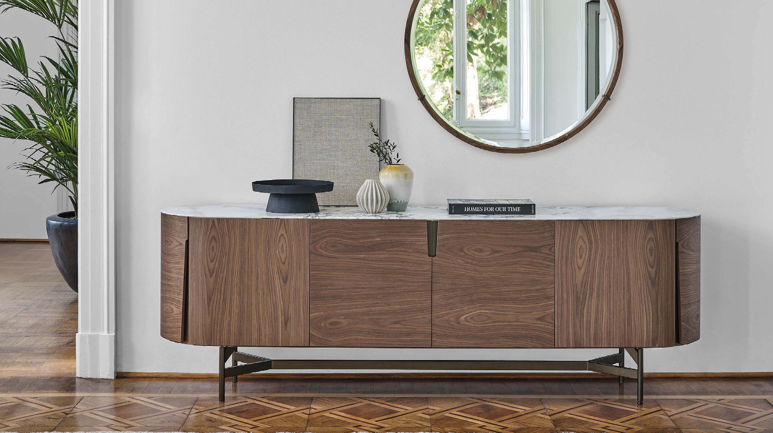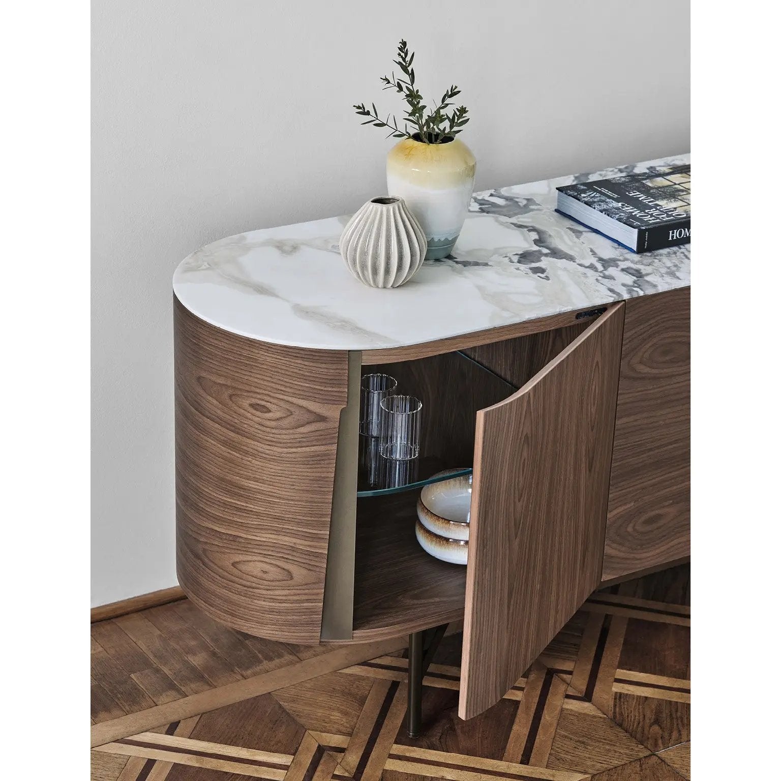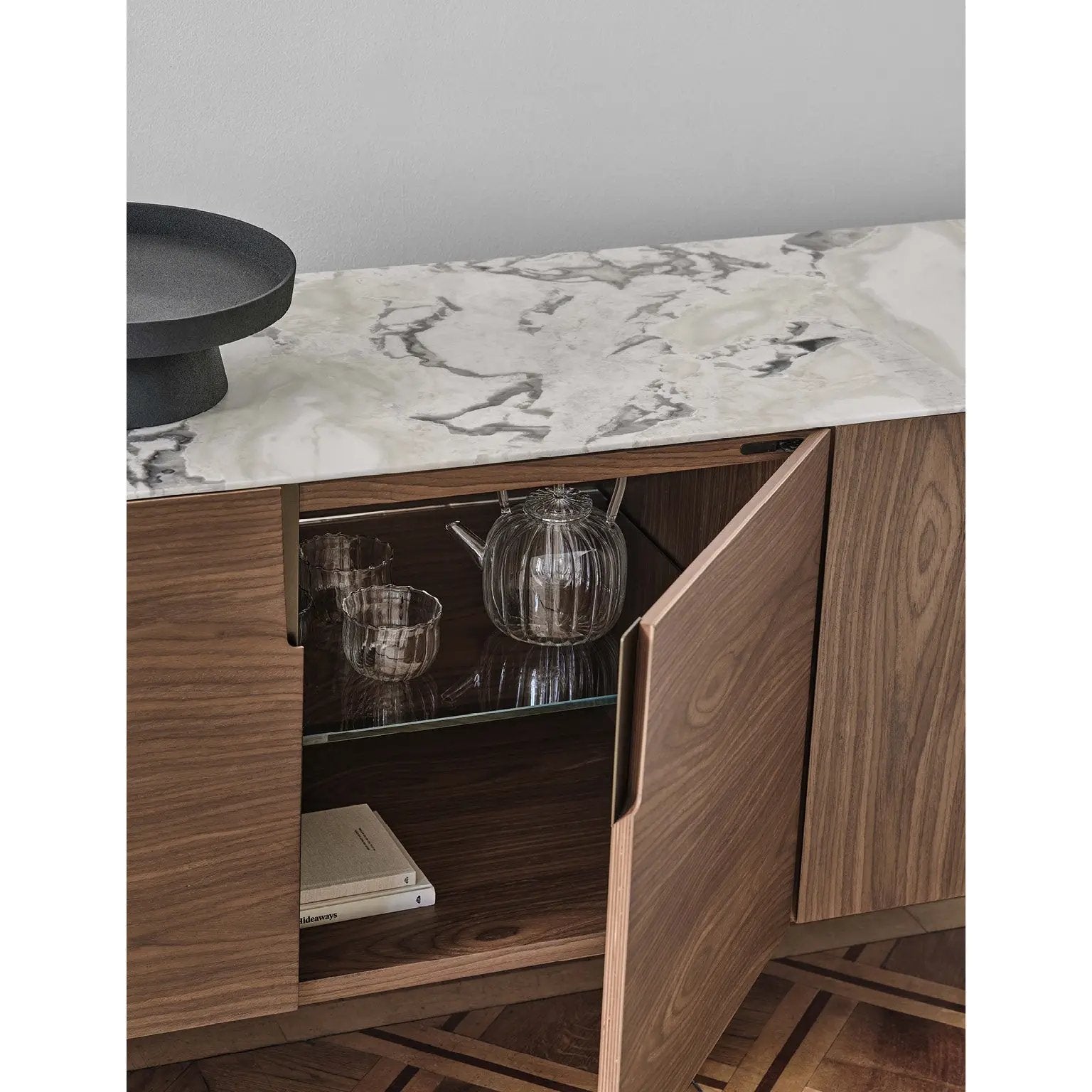 Like all products in the Vabches' collection, the three-compartment sideboard is a praise of soft, rounded shapes. The frame is made entirely of walnut and completed with a metal base in a Bronzoro finish that lends elegance to the product. The table top is made of marble. The deep attention to detail is expressed in the presence of recessed metal handles in finish that facilitate the opening of the central doors, while transparent glass shelves are inserted in all three compartments.