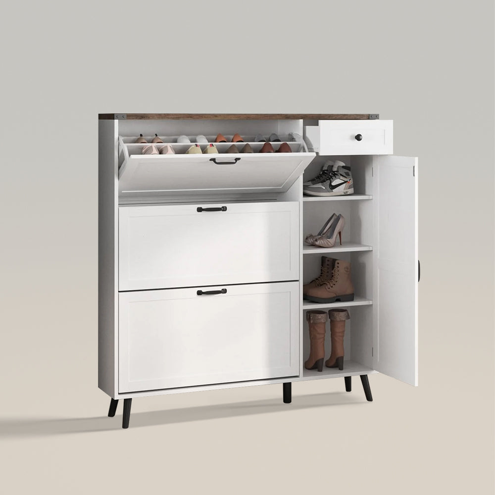 Large storage space---The shoe storage cabinet features three flip drawers,each containing 2 tiers inside,with adjustable compartments to fit various shoe heights.The side cabinet offers adjustable shelves tailored for your mid to tall boots. The spacious top surface and upper drawer are perfect for daily essentials,keys,wallets, and more.The bottom space conveniently stores frequently worn shoes for quick changes.